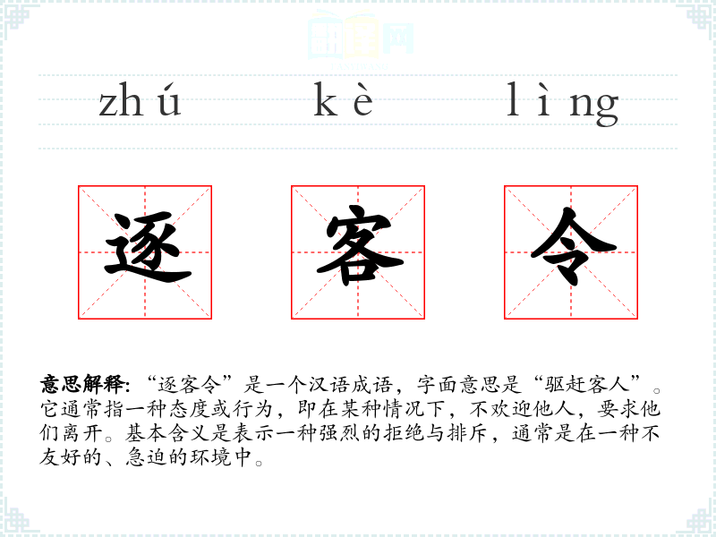 “逐客令”是一个汉语成语,字面意思是“驱赶客人”。它通常指一种态度或行为,即在某种情况下,不欢迎他人,要求他们离开。基本含义是表示一种强烈的拒绝与排斥,通常是在一种不友好的、急迫的环境中。