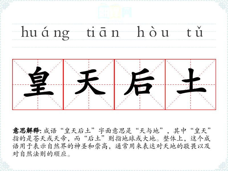 成语“皇天后土”字面意思是“天与地”,其中“皇天”指的是苍天或天帝,而“后土”则指地球或大地。整体上,这个成语用于表示自然界的神圣和崇高,通常用来表达对天地的敬畏以及对自然法则的顺应。