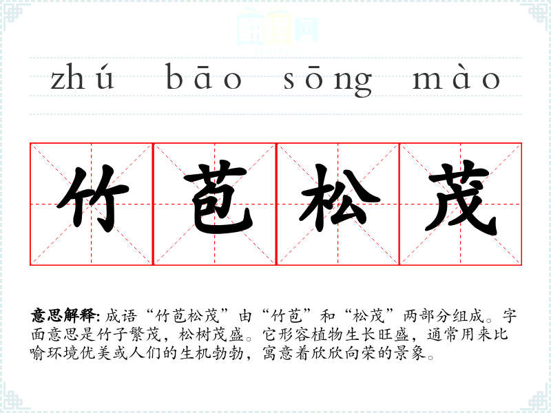 成语“竹苞松茂”由“竹苞”和“松茂”两部分组成。字面意思是竹子繁茂,松树茂盛。它形容植物生长旺盛,通常用来比喻环境优美或人们的生机勃勃,寓意着欣欣向荣的景象。