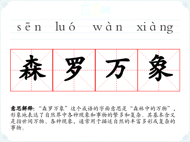 “森罗万象”这个成语的字面意思是“森林中的万物”,形象地表达了自然界中各种现象和事物的繁多和复杂。其基本含义是指世间万物、各种现象,通常用于描述自然的丰富多彩或复杂的事物。