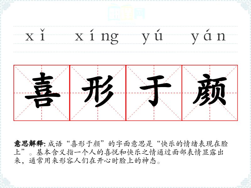 成语“喜形于颜”的字面意思是“快乐的情绪表现在脸上”。基本含义指一个人的喜悦和快乐之情通过面部表情显露出来,通常用来形容人们在开心时脸上的神态。