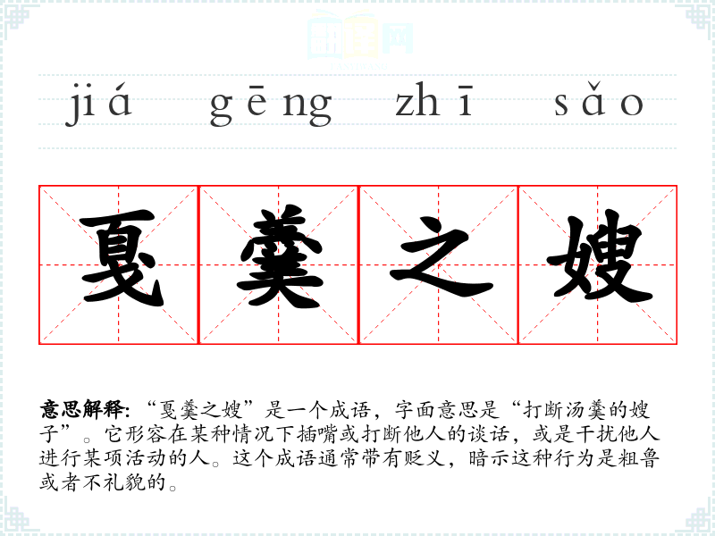 “戛羹之嫂”是一个成语,字面意思是“打断汤羹的嫂子”。它形容在某种情况下插嘴或打断他人的谈话,或是干扰他人进行某项活动的人。这个成语通常带有贬义,暗示这种行为是粗鲁或者不礼貌的。