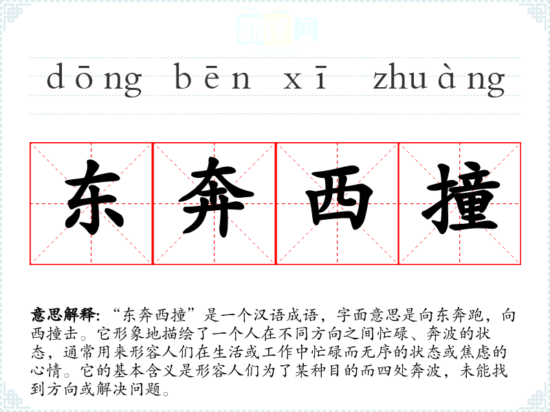 “东奔西撞”是一个汉语成语,字面意思是向东奔跑,向西撞击。它形象地描绘了一个人在不同方向之间忙碌、奔波的状态,通常用来形容人们在生活或工作中忙碌而无序的状态或焦虑的心情。它的基本含义是形容人们为了某种目的而四处奔波,未能找到方向或解决问题。