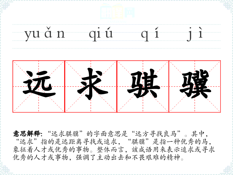 “远求骐骥”的字面意思是“远方寻找良马”。其中,“远求”指的是远距离寻找或追求,“骐骥”是指一种优秀的马,象征着人才或优秀的事物。整体而言,该成语用来表示追求或寻求优秀的人才或事物,强调了主动出击和不畏艰难的精神。