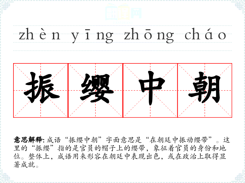 成语“振缨中朝”字面意思是“在朝廷中振动缨带”。这里的“振缨”指的是官员的帽子上的缨带,象征着官员的身份和地位。整体上,成语用来形容在朝廷中表现出色,或在政治上取得显著成就。