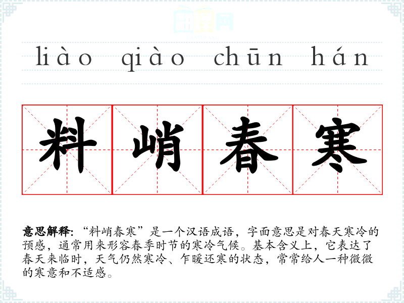 “料峭春寒”是一个汉语成语,字面意思是对春天寒冷的预感,通常用来形容春季时节的寒冷气候。基本含义上,它表达了春天来临时,天气仍然寒冷、乍暖还寒的状态,常常给人一种微微的寒意和不适感。