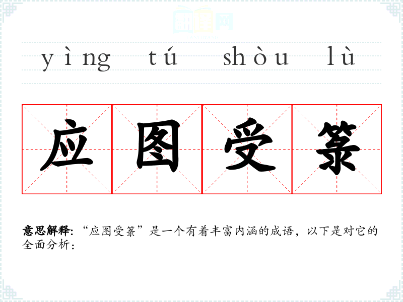 该成语的具体历史背景和典故较为模糊,但可以从其字面构成分析其内涵。“应图”意指要遵循某种计划或安排,“受箓”则暗示接受某种约束或规定。在古代,箓多指道教的符箓,用于约束和引导人的行为。因此,“应图受箓”可理解为在某种计划或指导下,接受相应的规范和约束。
