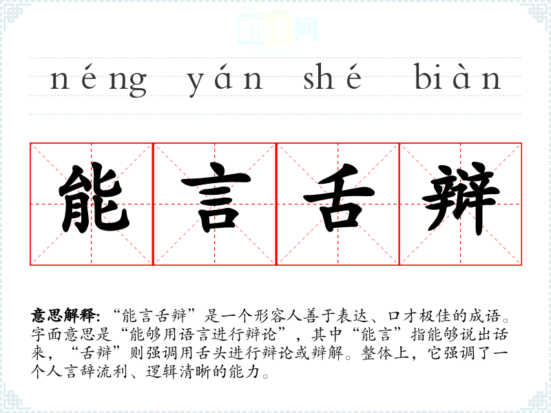 “能言舌辩”是一个形容人善于表达、口才极佳的成语。字面意思是“能够用语言进行辩论”,其中“能言”指能够说出话来,“舌辩”则强调用舌头进行辩论或辩解。整体上,它强调了一个人言辞流利、逻辑清晰的能力。