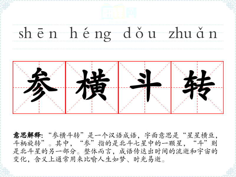 “参横斗转”是一个汉语成语,字面意思是“星星横亘,斗柄旋转”。其中,“参”指的是北斗七星中的一颗星,“斗”则是北斗星的另一部分。整体而言,成语传达出时间的流逝和宇宙的变化,含义上通常用来比喻人生如梦、时光易逝。