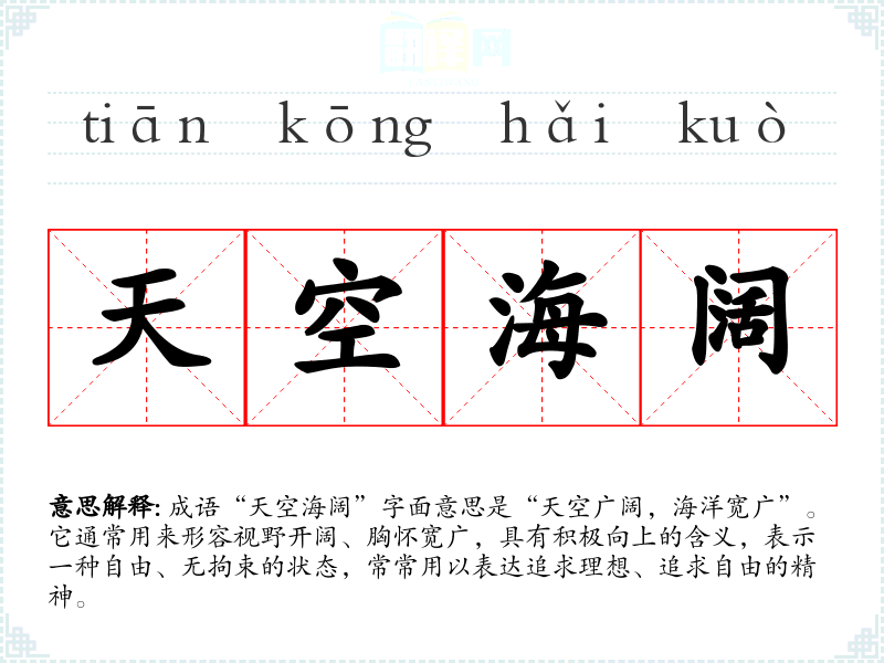 成语“天空海阔”字面意思是“天空广阔,海洋宽广”。它通常用来形容视野开阔、胸怀宽广,具有积极向上的含义,表示一种自由、无拘束的状态,常常用以表达追求理想、追求自由的精神。