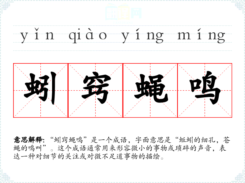 “蚓窍蝇鸣”是一个成语,字面意思是“蚯蚓的细孔,苍蝇的鸣叫”。这个成语通常用来形容微小的事物或琐碎的声音,表达一种对细节的关注或对微不足道事物的描绘。