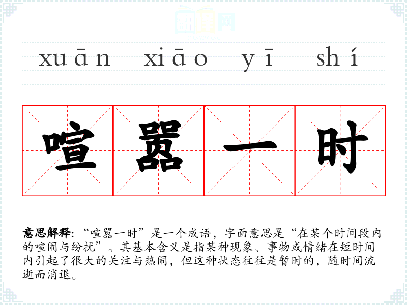 “喧嚣一时”是一个成语,字面意思是“在某个时间段内的喧闹与纷扰”。其基本含义是指某种现象、事物或情绪在短时间内引起了很大的关注与热闹,但这种状态往往是暂时的,随时间流逝而消退。