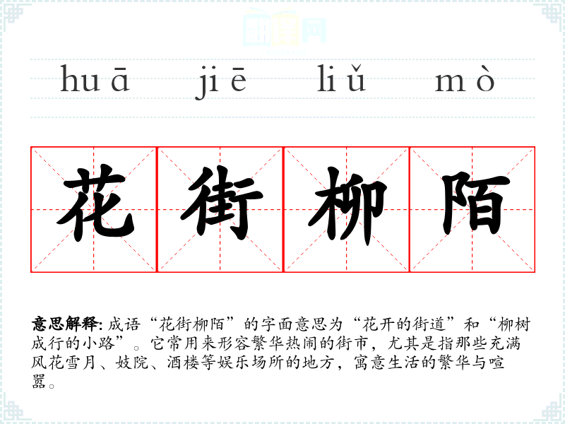 成语“花街柳陌”的字面意思为“花开的街道”和“柳树成行的小路”。它常用来形容繁华热闹的街市,尤其是指那些充满风花雪月、妓院、酒楼等娱乐场所的地方,寓意生活的繁华与喧嚣。