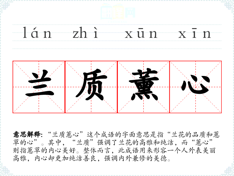 “兰质蕙心”源于古代诗词,其典故最早见于唐代诗人李白的诗作中,强调外在的美丽与内心的美德相辅相成。此成语在古代的文人雅士中广泛流传,常用来赞美女子的气质与修养。