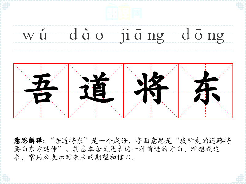 “吾道将东”是一个成语,字面意思是“我所走的道路将要向东方延伸”。其基本含义是表达一种前进的方向、理想或追求,常用来表示对未来的期望和信心。
