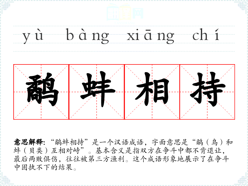| 鹬蚌相争,渔人获利 | 鹬:长嘴水鸟;蚌:有贝壳的软体动物。比喻双方争执不下,两败俱伤,让第三者占了便宜 |