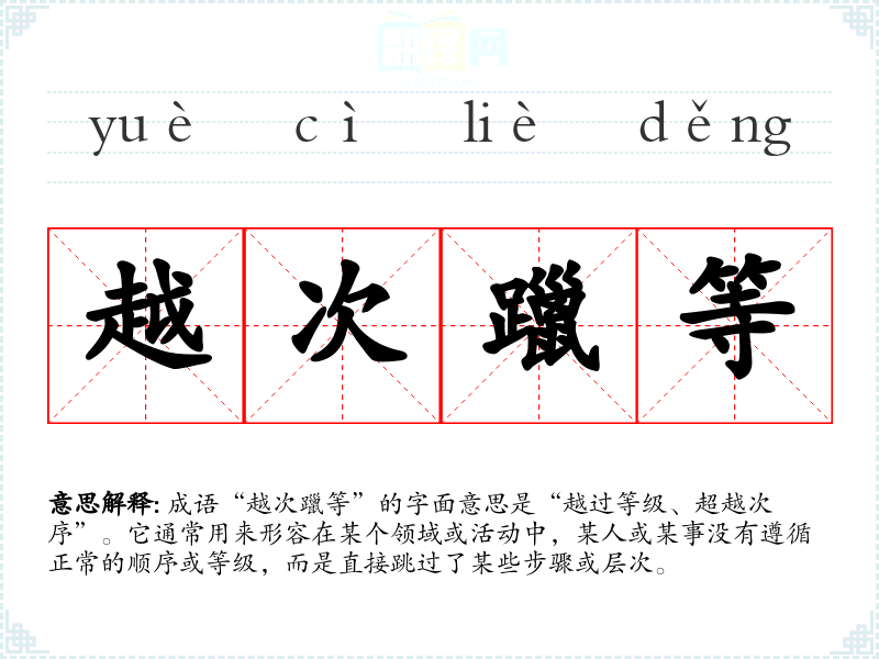 成语“越次躐等”的字面意思是“越过等级、超越次序”。它通常用来形容在某个领域或活动中,某人或某事没有遵循正常的顺序或等级,而是直接跳过了某些步骤或层次。