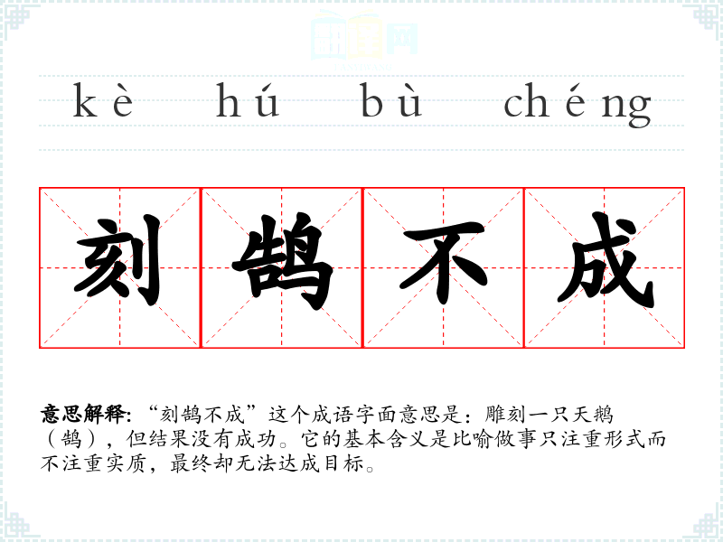 “刻鹄不成”这个成语字面意思是:雕刻一只天鹅(鹄),但结果没有成功。它的基本含义是比喻做事只注重形式而不注重实质,最终却无法达成目标。