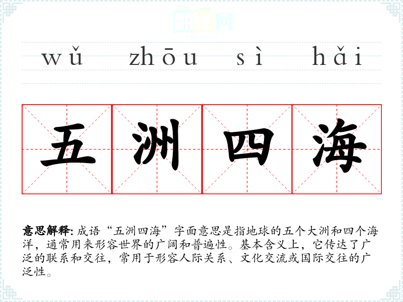 成语“五洲四海”字面意思是指地球的五个大洲和四个海洋,通常用来形容世界的广阔和普遍性。基本含义上,它传达了广泛的联系和交往,常用于形容人际关系、文化交流或国际交往的广泛性。