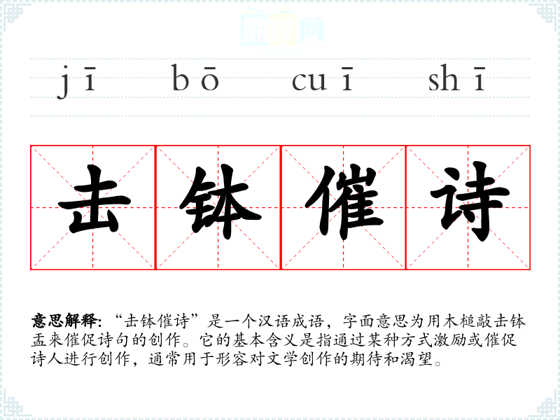 “击钵催诗”是一个汉语成语,字面意思为用木槌敲击钵盂来催促诗句的创作。它的基本含义是指通过某种方式激励或催促诗人进行创作,通常用于形容对文学创作的期待和渴望。