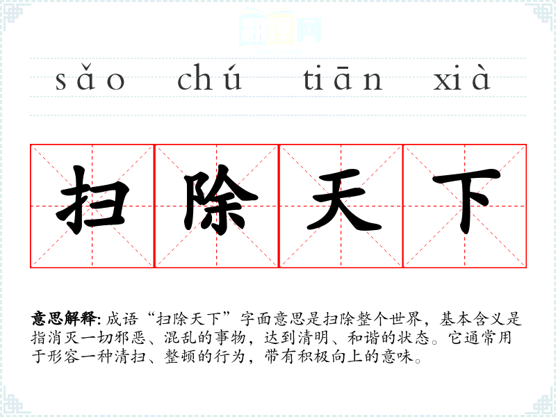 成语“扫除天下”字面意思是扫除整个世界,基本含义是指消灭一切邪恶、混乱的事物,达到清明、和谐的状态。它通常用于形容一种清扫、整顿的行为,带有积极向上的意味。