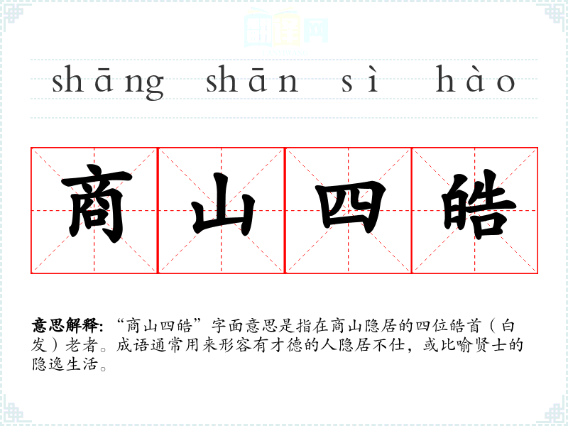 “商山四皓”字面意思是指在商山隐居的四位皓首(白发)老者。成语通常用来形容有才德的人隐居不仕,或比喻贤士的隐逸生活。