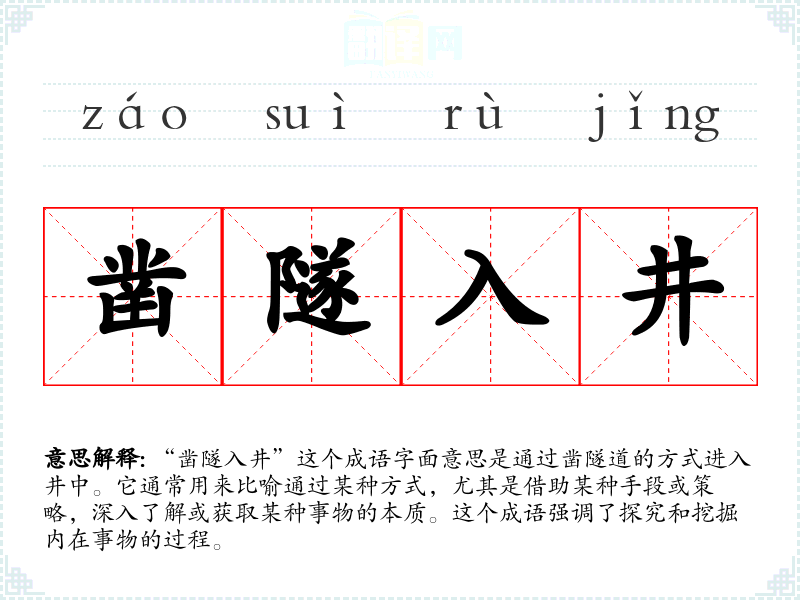 “凿隧入井”这个成语字面意思是通过凿隧道的方式进入井中。它通常用来比喻通过某种方式,尤其是借助某种手段或策略,深入了解或获取某种事物的本质。这个成语强调了探究和挖掘内在事物的过程。
