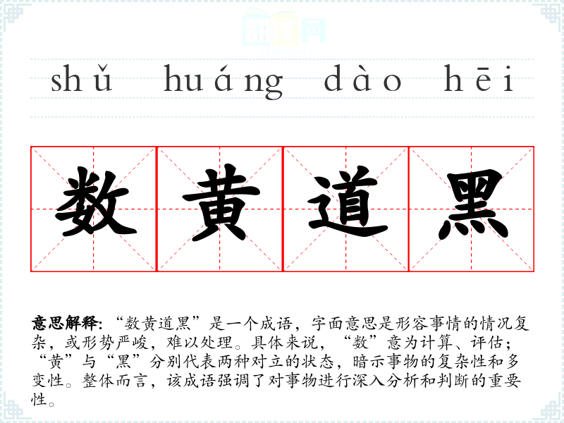 “数黄道黑”是一个成语,字面意思是形容事情的情况复杂,或形势严峻,难以处理。具体来说,“数”意为计算、评估;“黄”与“黑”分别代表两种对立的状态,暗示事物的复杂性和多变性。整体而言,该成语强调了对事物进行深入分析和判断的重要性。