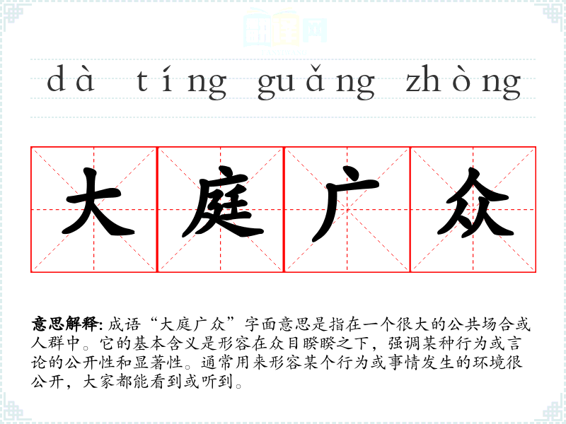 在英语中,可以用“in public”或“in front of everyone”来表达类似的意思,但它们不一定包含成语特有的文化内涵和历史背景。不同文化中对公开行为的重视程度有所不同,中文的“大庭广众”更加强调行为的社会影响。