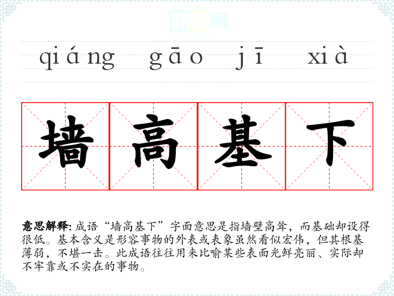 在现代社会中,尤其在商业和教育领域,追求表面光鲜的现象普遍存在。很多人或机构往往只注重外在形象,而忽略了内在的实质性建设。因此,“墙高基下”这一成语在当前社会背景下,具有警示作用,提醒人们重视事物的根基。