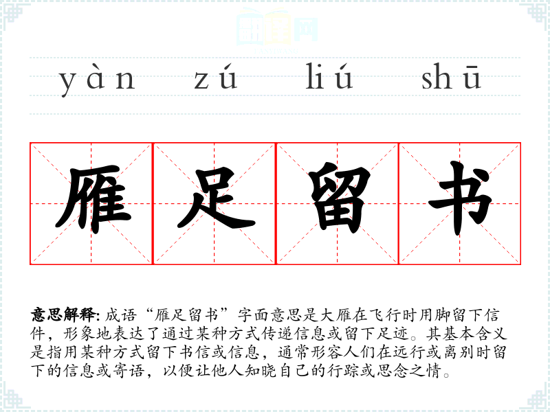 成语“雁足留书”字面意思是大雁在飞行时用脚留下信件,形象地表达了通过某种方式传递信息或留下足迹。其基本含义是指用某种方式留下书信或信息,通常形容人们在远行或离别时留下的信息或寄语,以便让他人知晓自己的行踪或思念之情。