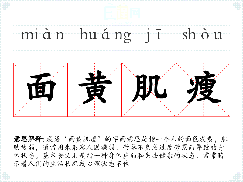 “面黄肌瘦”在**文化中常常与健康、生活状态密切相关。在传统观念中,身体的健康与精神状态是相互影响的,因此这个成语不仅仅是对外貌的描述,更反映了对生活方式、心理状态的关注。在现代社会中,虽然健康意识增强,但压力、快节奏的生活仍然容易导致人们出现“面黄肌瘦”的状态。