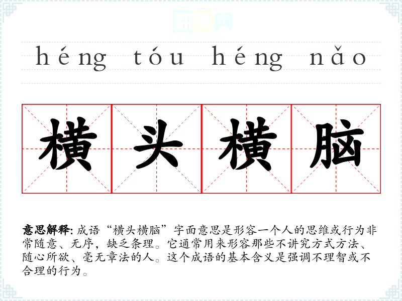成语“横头横脑”字面意思是形容一个人的思维或行为非常随意、无序,缺乏条理。它通常用来形容那些不讲究方式方法、随心所欲、毫无章法的人。这个成语的基本含义是强调不理智或不合理的行为。