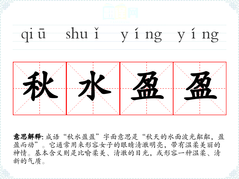 成语“秋水盈盈”字面意思是“秋天的水面波光粼粼,盈盈而动”。它通常用来形容女子的眼睛清澈明亮,带有温柔美丽的神情。基本含义则是比喻柔美、清澈的目光,或形容一种温柔、清新的气质。