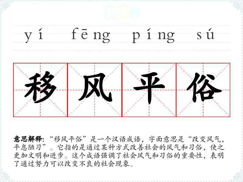 “移风平俗”出自《荀子·王制》,原文是“故君子之道,移风易俗”。这个成语反映了古代思想家对社会风气与*俗的重视,强调了通过教育和引导来改变社会风尚的必要性。