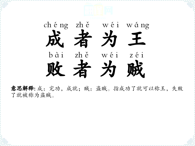 成:完功,成就;贼:盗贼。指成功了就可以称王,失败了就被称为盗贼。 |