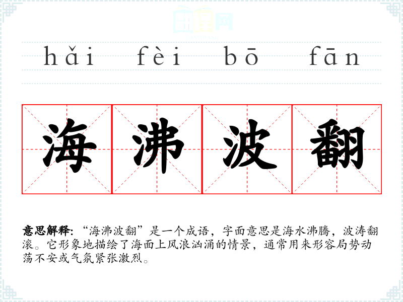 “海沸波翻”出自《汉书·王莽传》:“海沸波翻,风雨如晦。”这句话描绘了一个极其动荡的自然环境,进而引申为社会动荡或局势不稳的状况。通过对自然景象的生动描绘,成语强调了外在环境与内心情绪的互动。