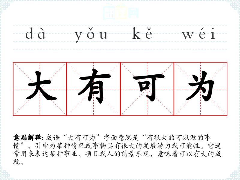 成语“大有可为”字面意思是“有很大的可以做的事情”,引申为某种情况或事物具有很大的发展潜力或可能性。它通常用来表达某种事业、项目或人的前景乐观,意味着可以有大的成就。