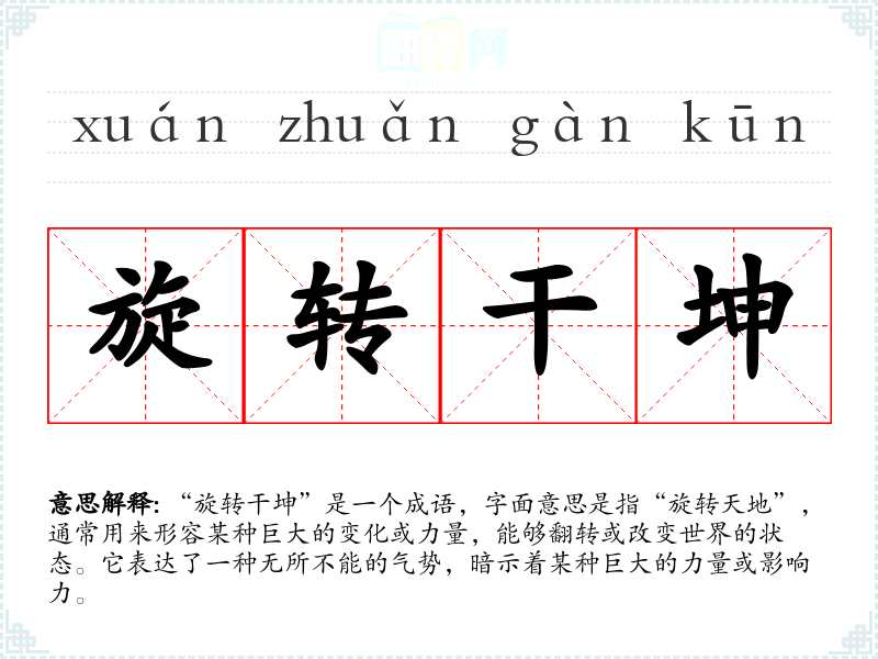 | 旋干转坤 | 扭转天地。比喻从根本上改变社会面貌或已成的局面。也指人魄力极大。 |