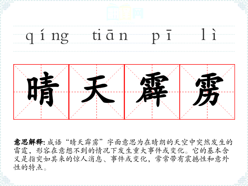 成语“晴天霹雳”字面意思为在晴朗的天空中突然发生的雷霆,形容在意想不到的情况下发生重大或变化。它的基本含义是指突如其来的惊人消息、或变化,常常带有震撼性和意外性的特点。