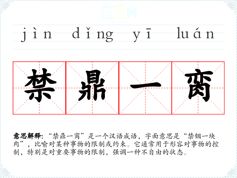 “禁鼎一脔”是一个汉语成语,字面意思是“禁锢一块肉”,比喻对某种事物的限制或约束。它通常用于形容对事物的控制,特别是对重要事物的限制,强调一种不自由的状态。