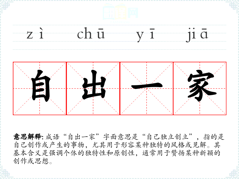 成语“自出一家”字面意思是“自己独立创立”,指的是自己创作或产生的事物,尤其用于形容某种独特的风格或见解。其基本含义是强调个体的独特性和原创性,通常用于赞扬某种新颖的创作或思想。