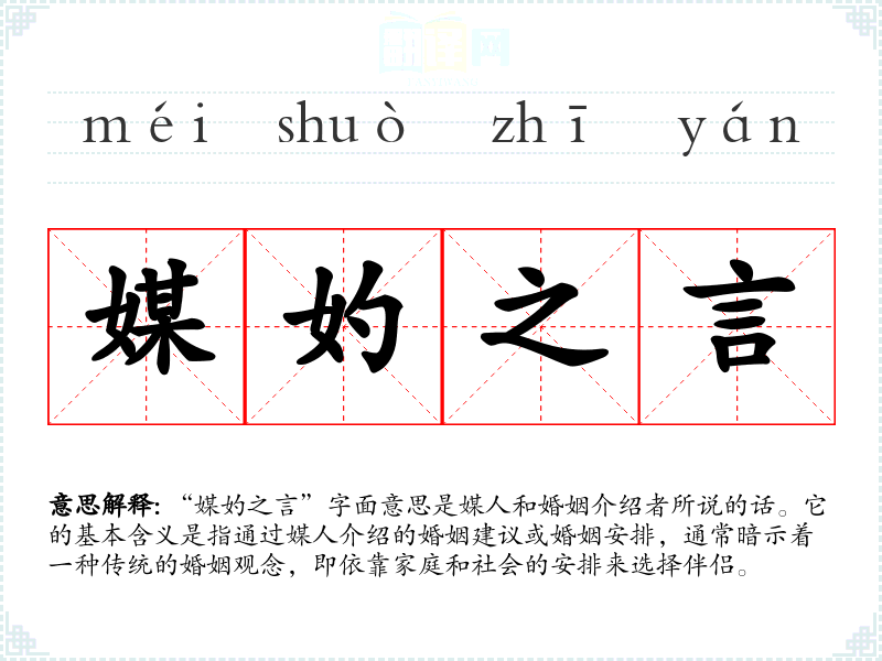“媒妁之言”字面意思是媒人和婚姻介绍者所说的话。它的基本含义是指通过媒人介绍的婚姻建议或婚姻安排,通常暗示着一种传统的婚姻观念,即依靠家庭和社会的安排来选择伴侣。