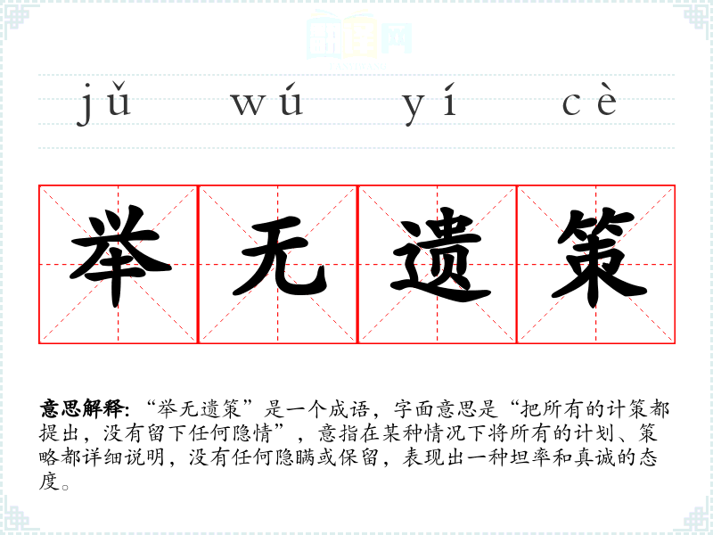 - 日常对话:在讨论方案、计划时,提到“举无遗策”可以表达希望对方能坦诚和全面地分享自己的想法。
