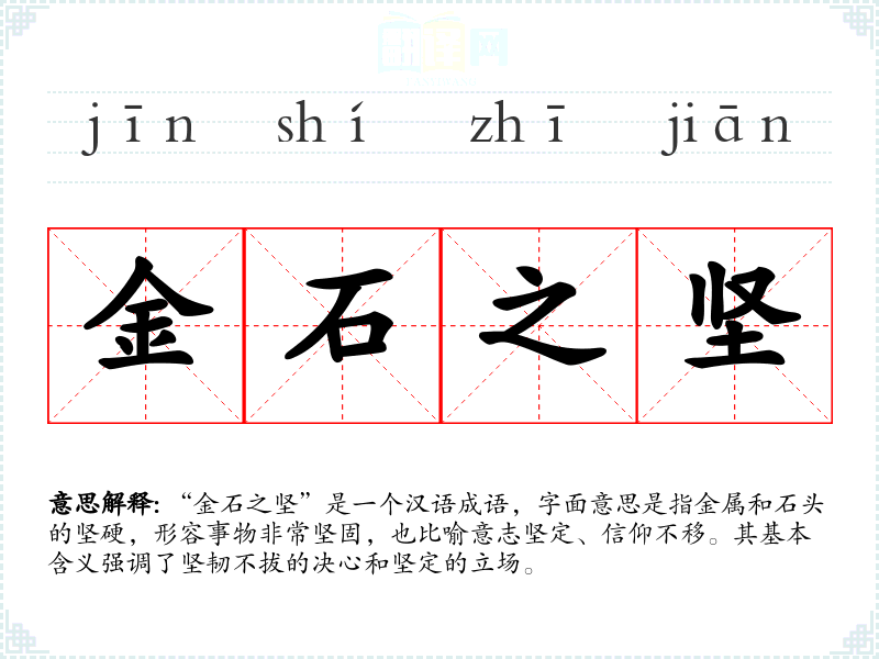 “金石之坚”是一个汉语成语,字面意思是指金属和石头的坚硬,形容事物非常坚固,也比喻意志坚定、信仰不移。其基本含义强调了坚韧不拔的决心和坚定的立场。