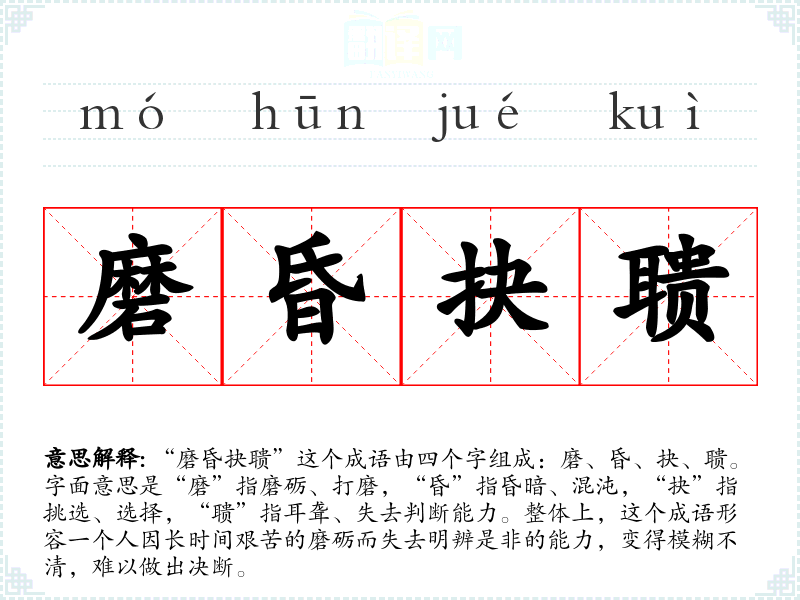 “磨昏抉聩”这个成语由四个字组成:磨、昏、抉、聩。字面意思是“磨”指磨砺、打磨,“昏”指昏暗、混沌,“抉”指挑选、选择,“聩”指耳聋、失去判断能力。整体上,这个成语形容一个人因长时间艰苦的磨砺而失去明辨是非的能力,变得模糊不清,难以做出决断。