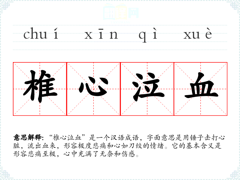 “椎心泣血”是一个汉语成语,字面意思是用锤子击打心脏,流出血来,形容极度悲痛和心如刀绞的情绪。它的基本含义是形容悲痛至极,心中充满了无奈和伤感。