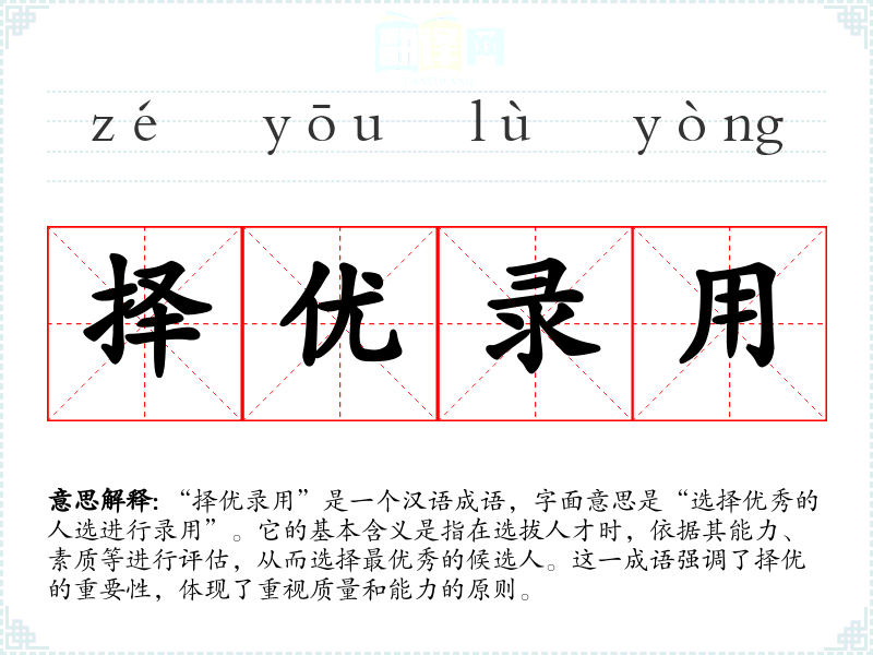 “择优录用”是一个汉语成语,字面意思是“选择优秀的人选进行录用”。它的基本含义是指在选拔人才时,依据其能力、素质等进行评估,从而选择最优秀的候选人。这一成语强调了择优的重要性,体现了重视质量和能力的原则。