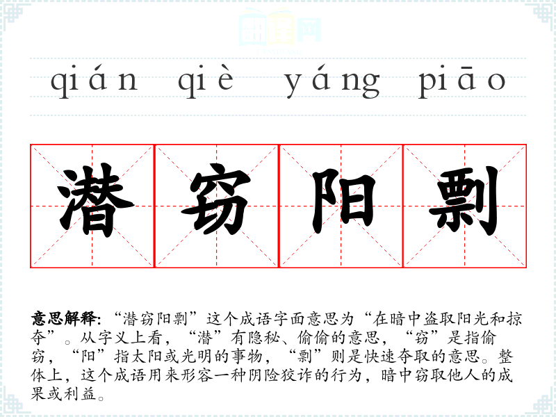 “潜窃阳剽”这个成语字面意思为“在暗中盗取阳光和掠夺”。从字义上看,“潜”有隐秘、偷偷的意思,“窃”是指偷窃,“阳”指太阳或光明的事物,“剽”则是快速夺取的意思。整体上,这个成语用来形容一种阴险狡诈的行为,暗中窃取他人的成果或利益。