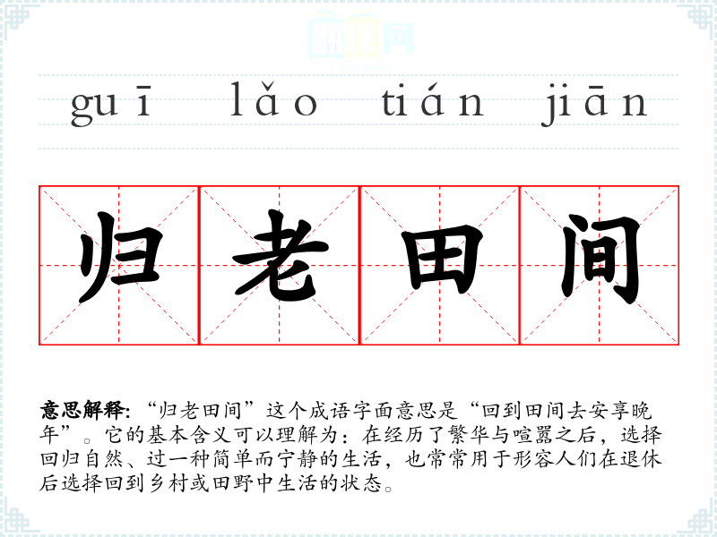 “归老田间”这个成语字面意思是“回到田间去安享晚年”。它的基本含义可以理解为:在经历了繁华与喧嚣之后,选择回归自然、过一种简单而宁静的生活,也常常用于形容人们在退休后选择回到乡村或田野中生活的状态。
